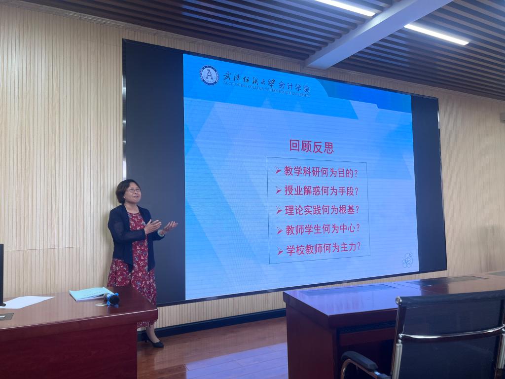 刘书兰教授做了题为《湖北省线下一流课<审计学原理>建设体会》的讲座,从申报过程、经验与启示两部分依次展开。省级线下一流课程申报功在平时,不仅要对教学目标、授课方式、考核评价体系进入有机融合;还应积极引入先进教学理论和新颖教学方法。申报时要深入领会申报要求和提前了解评价指标,然后对教学素材进行梳理、归类;在此基础上凝练创新点和特色之处,行文时注意言简意赅、图文并茂。作为一名资深教师,刘书兰教授结合30余年的教学经验,对青年教师的成长提出了谆谆嘱托:一是牢记立德树人使命;二是积极投身和勇于创新教学实践;三是坚持积累实现质变;四是勤于思考和提炼升华;五是回顾反思并持续改进。