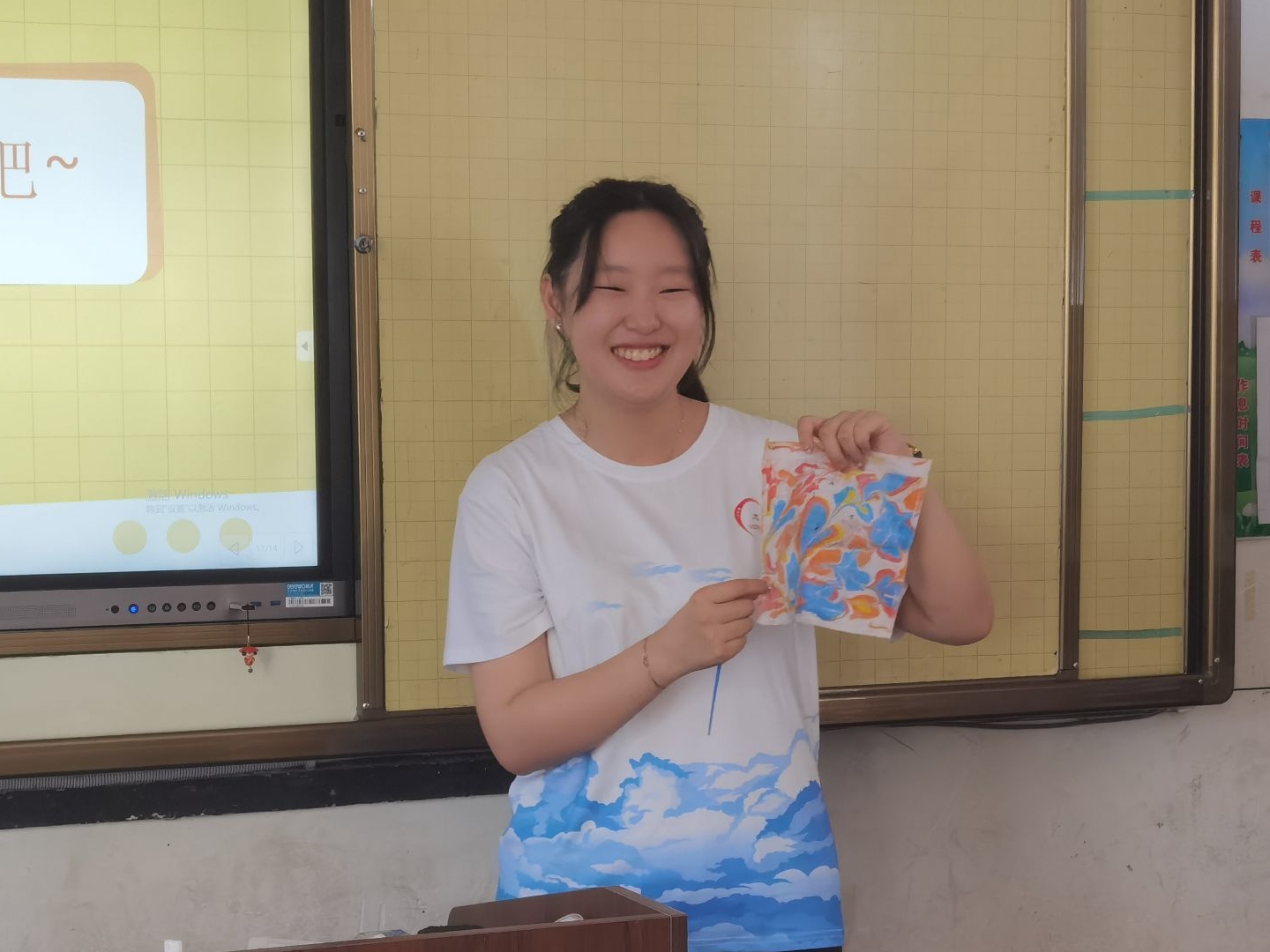 图为志愿者向小朋友展示水拓丝巾,小朋友们自己动手,将脑中的奇思妙想都绘制于丝巾上,展现出童真的美好。中国青年网通讯员 尹力 摄