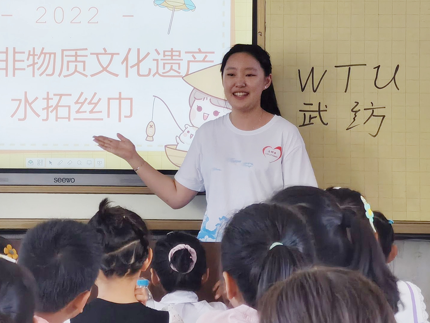 图为志愿者像小朋友们介绍非物质文化遗产—水拓画,水拓画以水为纸,以云为名,在画中凝聚了易逝的自然之美,化瞬间为不变的永恒。小朋友们被水拓画的奇妙所吸引。中国青年网通讯员 尹力 摄