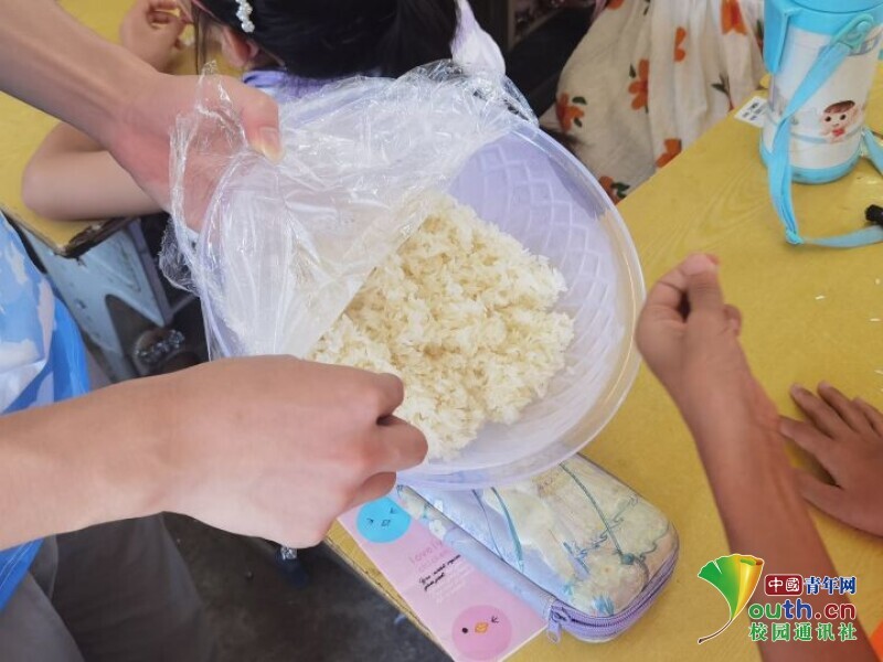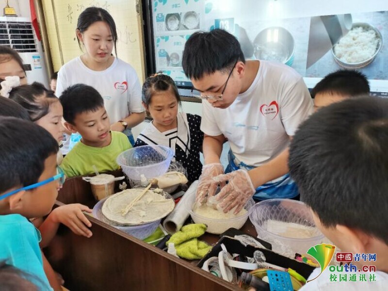 图为小朋友在志愿者的带领下清洗浸泡米酒,再晾干放入酒曲,然后静静等待醇香米酒的出炉。中国青年网通讯员 尹力 摄
