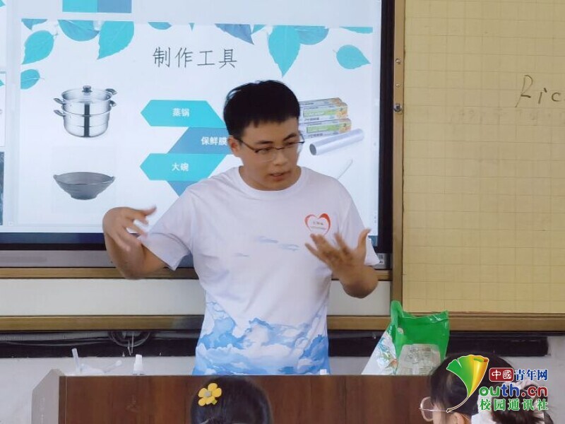 图为志愿者为小朋友们介绍长江沿岸地区的自然风景与悠久文化,讲解孝感文化特色——米酒。中国青年网通讯员 尹力 摄