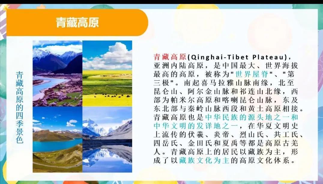 “小朋友们,让我们一起朗读这首《咏华山》吧!”“只有天在上,更无山与齐……”,志愿者程睿曦以诗句为引,向小朋友们介绍我国各地的特点。她选取北京、陕西、上海、云南、海南和青藏高原等地为代表,通过播放视频和展示照片,向小朋友们讲解祖国广袤山河的特色风景、气候差异和著名景点。