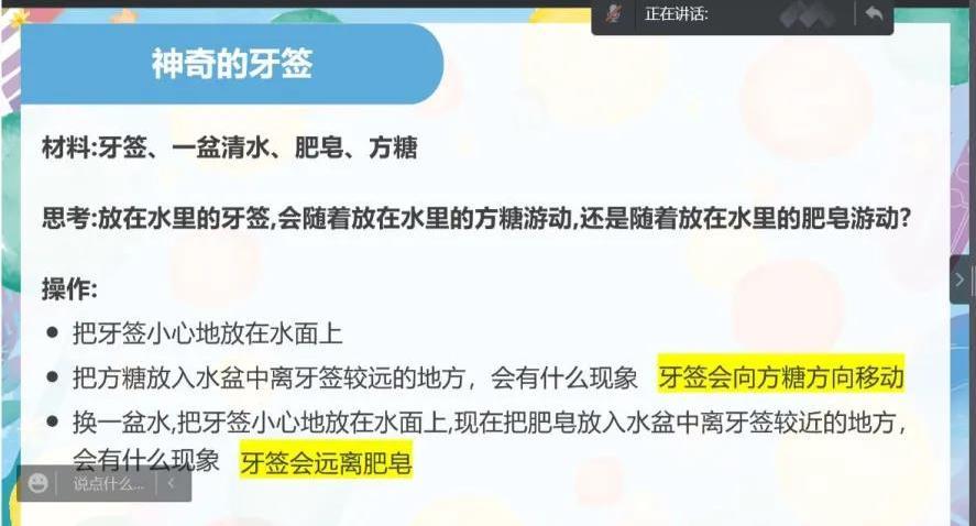志愿者鲍晓佳依次播放了“汤匙变磁铁”“可爱的浮水印”“神奇的牙签”和“抓住气球的杯子”等小实验的视频,小朋友们看完惊叹不已,纷纷从家里寻找实验道具,在云端和志愿者一起做了这些实验。实验完成后,鲍晓佳耐心地讲解实验原理,“哇,原来是这样,好神奇啊!我以后一定要多多观察生活中的小奥妙。”小朋友们纷纷感叹道。