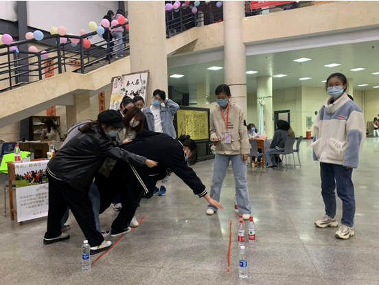 游戏过程中,同学们相互讨论,与室友、同学的关系在不知不觉中不断拉近。也有一些测试反应速度的活动,比如“看字识色”、“答非所闻”,就需要敏捷的反应能力,透过现象探寻本质。此次游园会也准备了“气球传纸杯”、“雷区取水”、“蒙眼化妆”和“背后画画”等团队合作的活动,在同学们默契的合作与轻松的交流下,一个个困难被顺利解决。