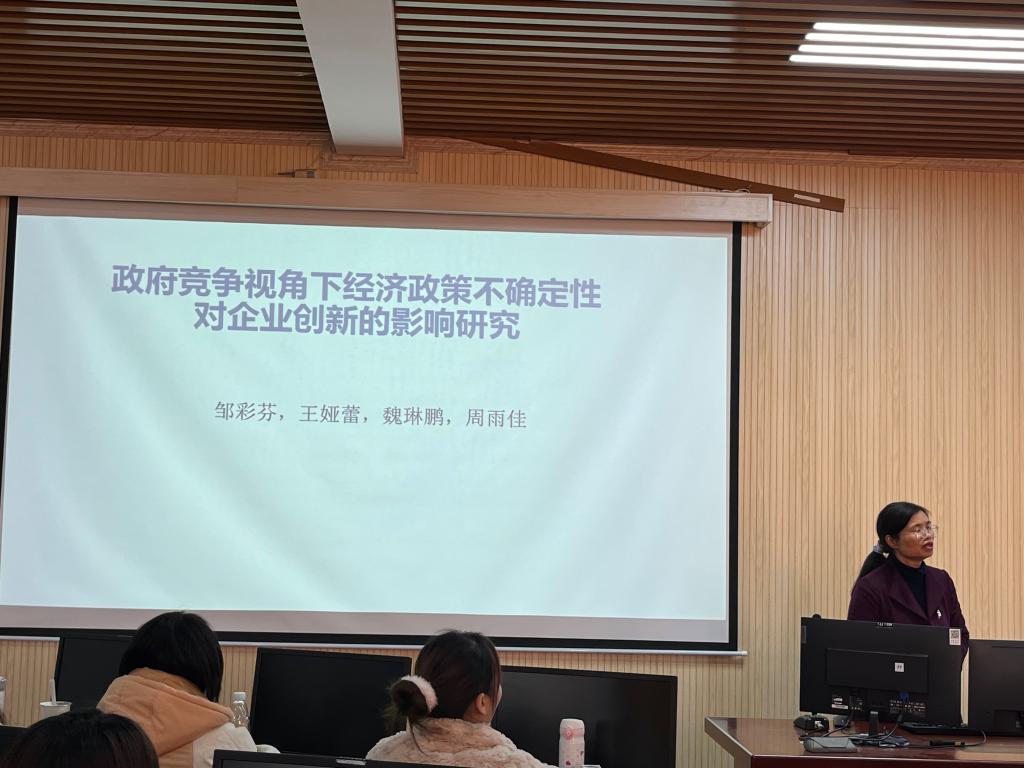 邹彩芬教授以《政府竞争视角下经济政策不确定性对企业创新的影响研究》为主题进行学术汇报。邹教授首先介绍了文章的选题背景,分享了2008年以来和新冠疫情以来经济波动导致政策不确定性对经济生活和微观主体的影响,并从企业层面和国家层面探讨了技术创新的作用和我国实施创新驱动发展战略的紧迫性。研究选取了2007年—2020年A股上市公司的数据,构建包含宏观经济政策不确定性指标、地方政府和上市公司特征变量的实证面板数据,基于政府竞争角度阐述了经济政策不确定性对企业创新行为的影响机制。研究结论为经济不确定性的环境下,中央政府如何合理引导地方政府良性有序竞争、从而促进企业提升创新能力提供了启示。