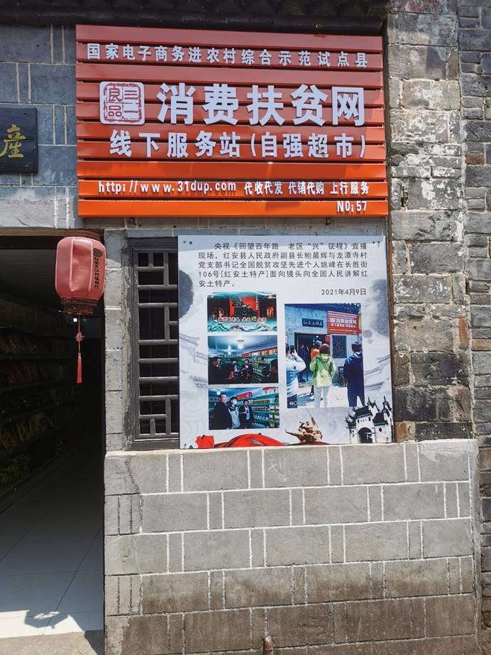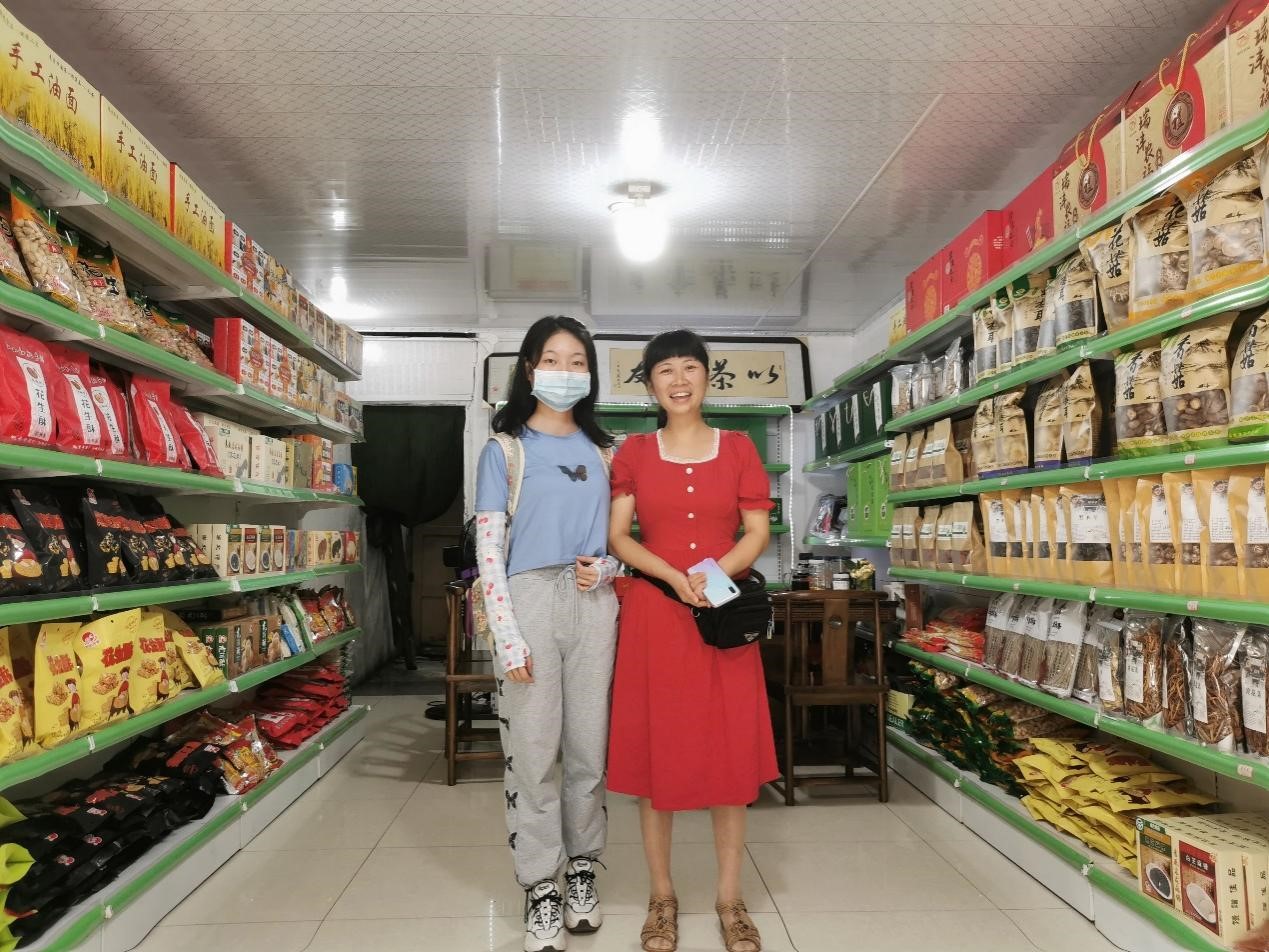 在走访中,实践队员们看到长胜街的很多门店旁都挂着“消费扶贫网线下服务站”的牌子,一位售卖红安土特产的女店主自豪地说:“从前年9月起这个牌子就挂上去了,我们通过国家建立的扶贫网和八十余家电商平台吸引游客和在外务工的家乡人来购买红安的农产品,每年可以赚到不少钱咧!”与多家店主沟通后,实践队员们得知,经过两年的发展,红安县线上线下一体化的产销模式逐渐成熟,花样百出的直播带货成为了长胜街上的新时尚,而高品质、有特色、接地气的农产品更是为各商户吸引了大量回头客,为当地经济的发展和人民生活品质的提高再添一把“火”。