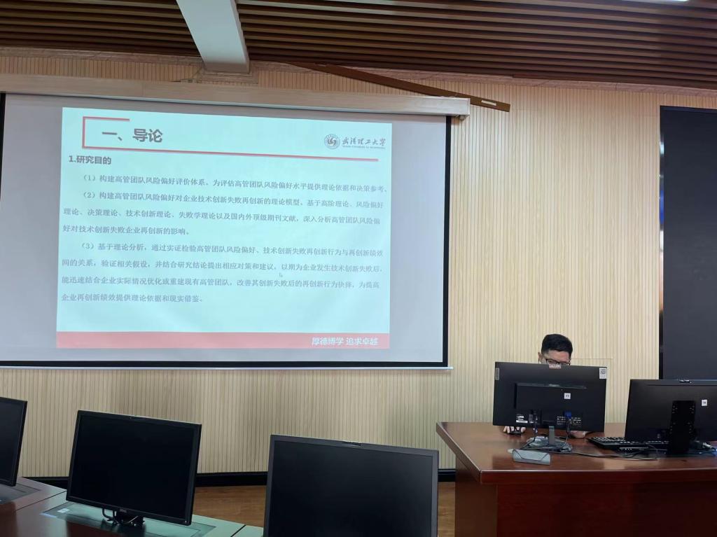张洋博士以《高管团队风险偏好对技术创新失败企业再创新影响机理研究》为题进行学术汇报。报告以医药行业为研究对象,主要探讨了高管团队风险偏好对企业发生技术创新失败后的再创新行为以及再创新绩效的影响。研究发现医药行业企业往往在发生技术创新失败后,过多的热衷于开发与先前失败项目无关的新创项目,而忽略了失败项目的潜在价值。虽在技术开发阶段的再创新绩效取得很好的专利申请绩效,但在成果转化阶段的再创新绩效则并未按照预期转化为良好的市场经济价值,造成了过多的专利处于一种“休眠”状态。最后,根据以上结论,从政府和企业两个角度提出对策和建议。