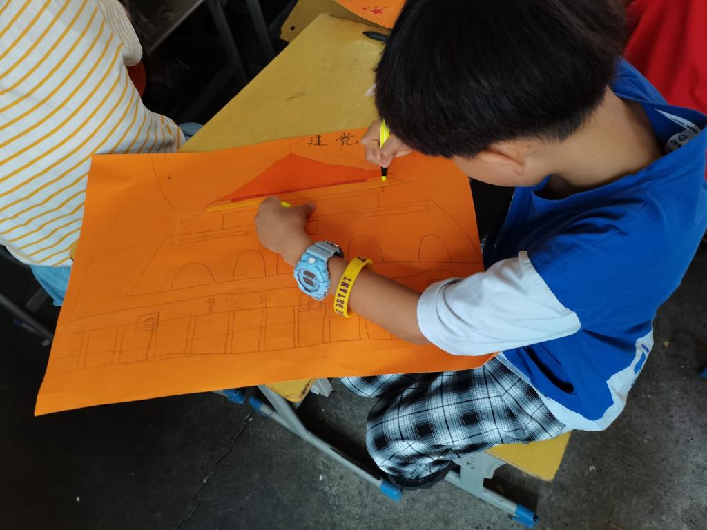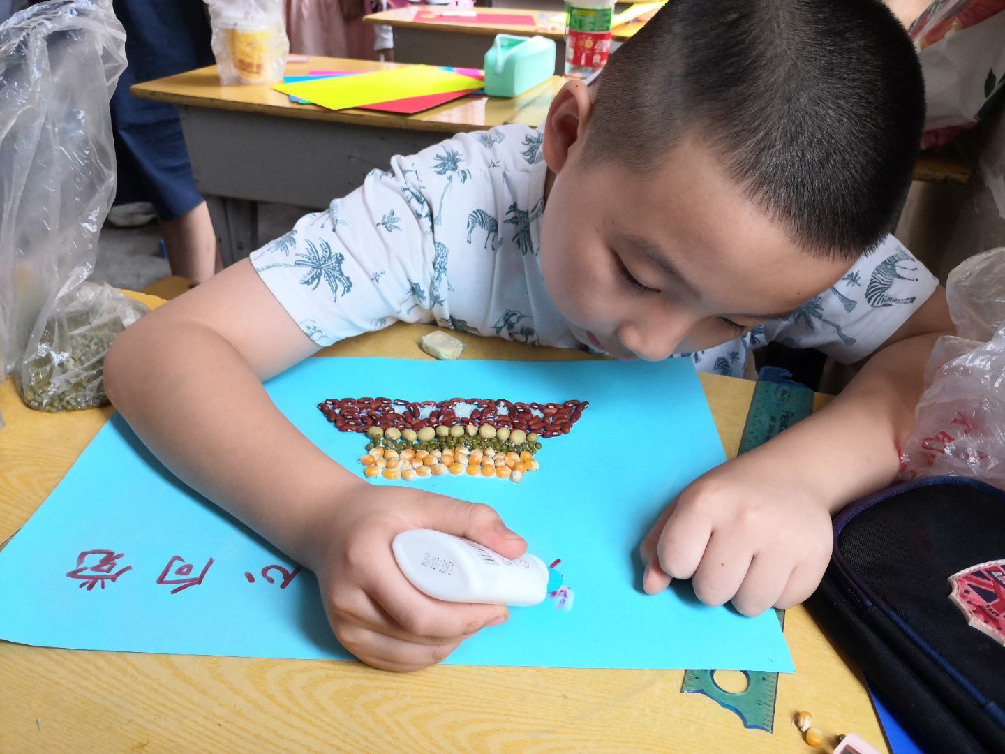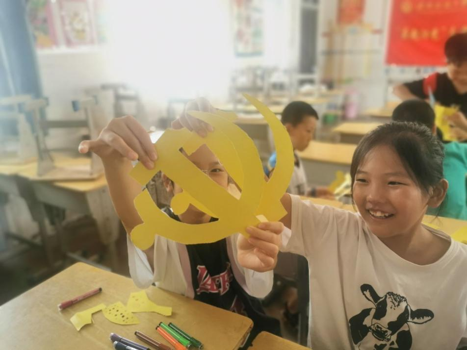 为使党史学习更符合小学生的特点,志愿者还组织小朋友们通过彩笔画、豆子画、剪纸等多种形式表达对党和国家的热爱。