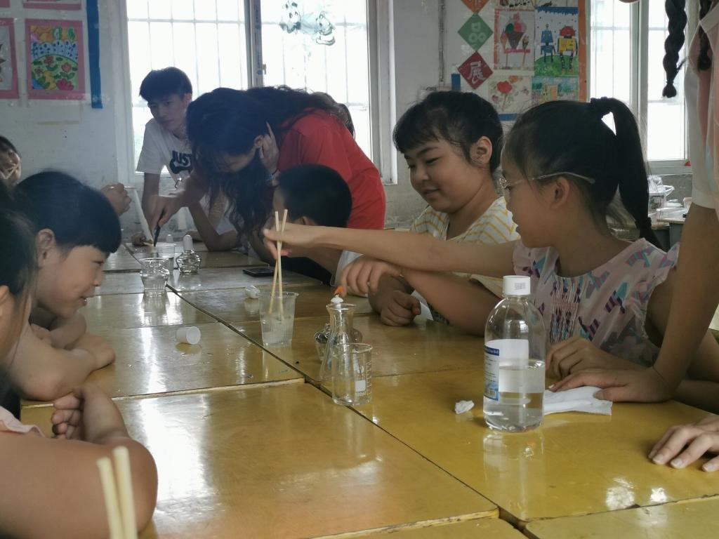 “三根火柴如何提起一瓶水?”“手帕为什么无法燃烧?”“有孔的纸为什么能拖住水?”“如何在家里造彩虹?”“酸和碱碰到一起会产生什么颜色的变化呢?”……为了激发小朋友们的学习兴趣,每次实验前,志愿者都会抛出一个问题,小朋友一边看志愿者演示,一边从现象里寻找问题的答案。有趣的实验现象加上志愿者风趣幽默的讲解,极大调动了小朋友们探索科学世界的热情,让小朋友们在快乐实践中不断学习新知识。