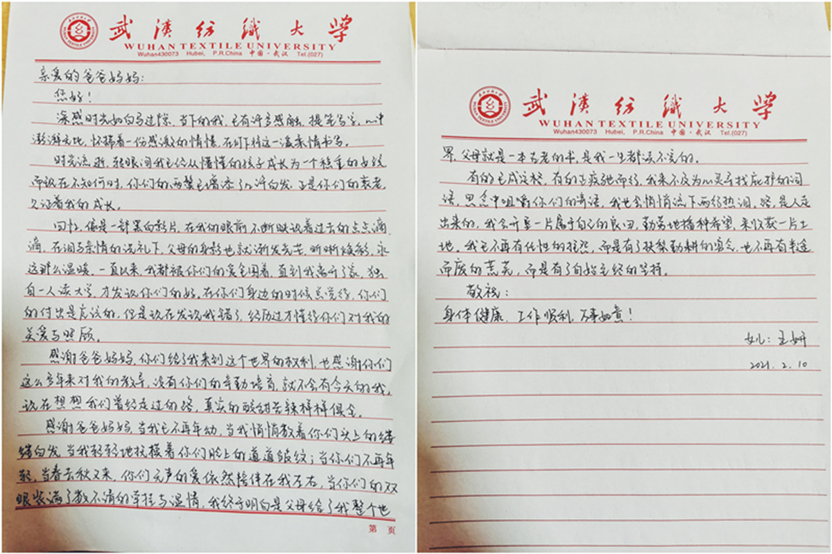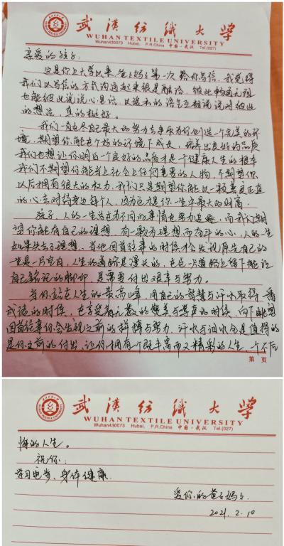 会计11903班同学妈妈在回信中写道:“我们想一直都能保护你,希望你一直不用长大,但这显然是不可能的,你必然会经历一些困难,这也是我们无法阻挡的。外面的风雨再大,家里永远都是温暖的。”平淡真诚的话语饱含着爱。请记得人总会长大,生活再苦,家永远是我们的避风港。