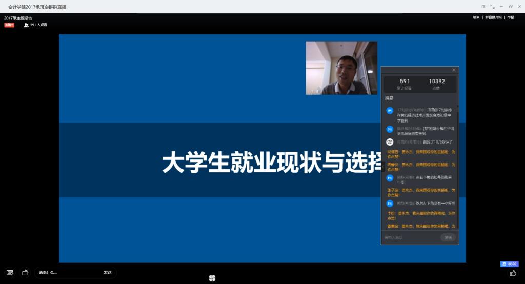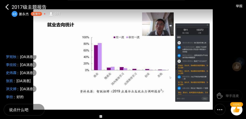5月10日,10大菠菜信誉担保网举办大学生职业生涯规划线上讲座,10大菠菜信誉担保网党委副书记姜永杰以《大学生就业现状与选择》为题作主题讲座,2017级辅导员和近600名学生聆听报告会。