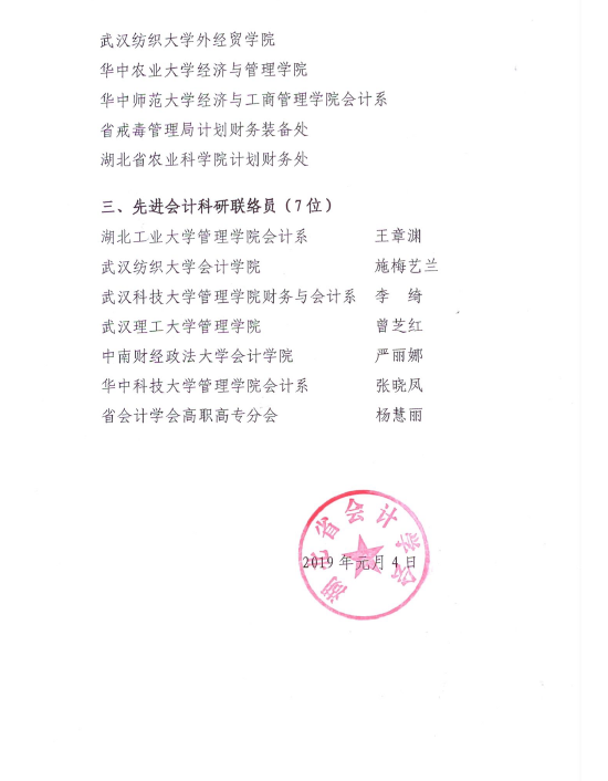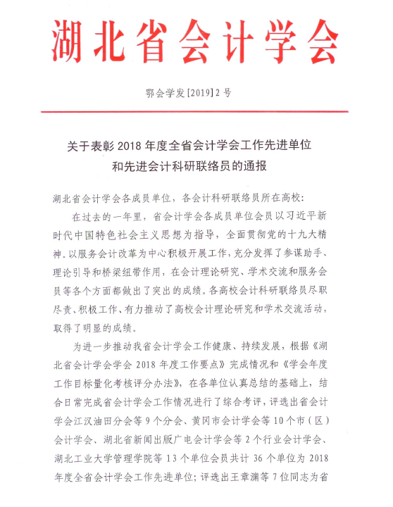 2019年1月,湖北省会计学会对2018年度积极开展理论研究、参与学术活动、培养会计人才、为省会计学会的发做出贡献的单位及个人进行了表彰,全讯白菜网090010大菠菜信誉担保网获评全省先进单位会员,施梅艺兰老师获评先进会计科研联络员称号。