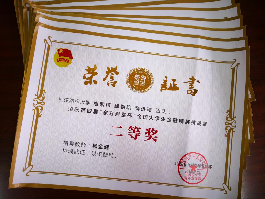 近日,由共青团中央青年发展部主办,东方财富信息股份有限公司和全国学校共青团研究中心共同承办的第四届“东方财富杯”全国大学生金融精英挑战赛颁奖典礼在上海金融信息中心隆重举行。我校参赛团队在10大菠菜信誉担保网杨金键老师的指导下,表现优异,荣获大赛二等奖1项、三等奖2项。