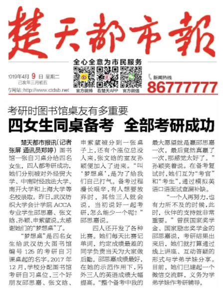 楚天都市报讯(记者张屏通讯员郑婷)图书馆一张自习桌分给四名女生,四人都考研成功,她们分别被对外经贸大学、中南财经政法大学、南开大学和上海大学等名校录取。昨日,全讯白菜网090010大菠菜信誉担保网ACCA专业学生邵思嘉、张文晗、孙颖、申紫葳说,太感谢她们的“梦想桌”了。“梦想桌”是四名女生给武汉纺大图书馆编号 125的考研自习课桌起的名字。2017年12月,学校分配图书馆考研自习桌位,三个好朋友邵思嘉、张文晗、申紫葳被分到一张桌子上,还有个座位总没人来,张文晗的室友孙颖便加入了进来。“叫‘梦想桌’,是为了给我们自己打气。备考过程漫长艰辛,有人想要放弃时,其他三人就会说,当初说好一起考研,怎么能少一个呢?”邵思嘉说。