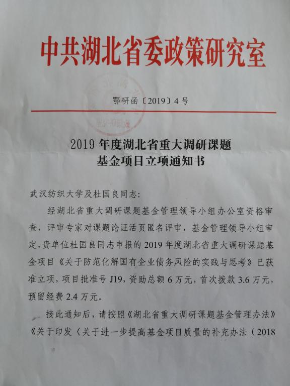 近日,湖北省委政研室公布了2019年度湖北省重大调研课题基金项目立项名单,10大菠菜信誉担保网党委书记、院长杜国良教授主持申报的课题“关于防范化解国有企业债务风险的实践与思考”获准立项。