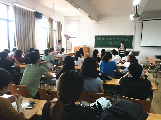 为确保毕业生愉快、顺利、安全、文明离校,5月28日上午10:00,会计学院辅导员李欣和龚俊老师在7号教学楼402召开毕业生感恩教育和文明离校主题班会。