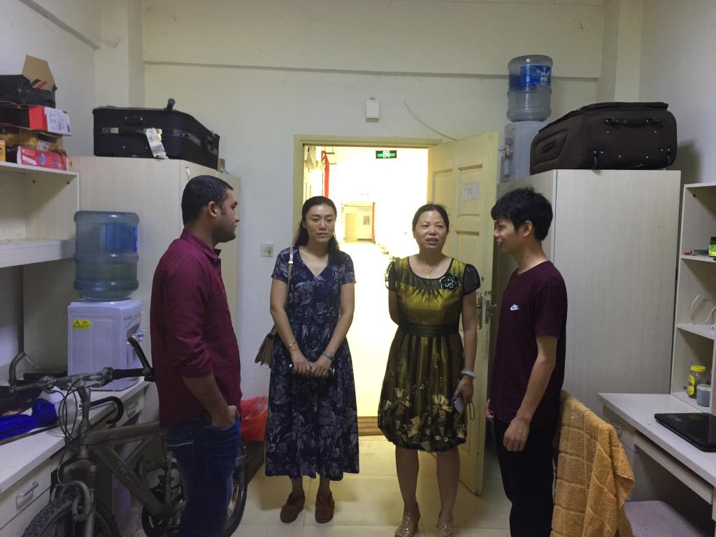 2017年9月26号,为配合省教育厅针对留学生下发的专项督查通知,落实学校开展的专项督查准备会议精神,在学院党委书记樊敏的带领下,10大菠菜信誉担保网相关老师前往本院留学生宿舍,排查安全隐患,开展安全教育,关心留学生生活学习情况。