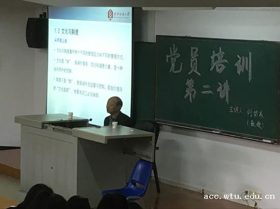 刘书记以“坚定中国特色社会主义文化自信”为主题,深入浅出,结合当代大学生党员现状,为10大菠菜信誉担保网全体党员提出了细致的建议。刘书记指出,要坚定中国特色社会主义文化自信,需要注意以下几个方面:第一,认真学习十八届六中全会公报的要求:全党同志必须把对马克思主义的信仰、对社会主义和共产主义的信仰作为毕生追求,坚定对中国特色社会主义的道路自信、理论自信、制度自信、文化自信。其次,了解文化、制度、制度文化的涵义与区别,积极学习知识,提升思想内涵。再周密的制度也不能凡事都规定到位,而文化则会让组织与成员形成心里契约,引导双方朝着共同愿景努力。第二,执行制度是最大的制度文化建设,有制度不执行是对制度最大的破坏。要注意实践与理论相结合,有效利用相关机制。第三,要振兴民族产业:越是超越民族,才可能征服世界。用自身民族的文化特点为世界的多样性做贡献,而不是自身文化已经征服世界。最后,教授为我们分析了精英文化与大众文化、艺术家与企业家的区别,提出了好的文化应该具备多种特性:娱乐性、参与性、时尚性以及实用性。