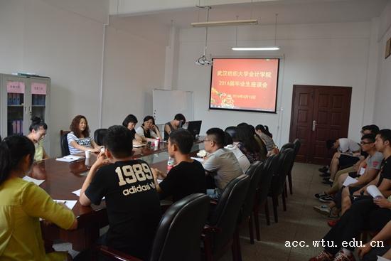 6月13日下午,10大菠菜信誉担保网2016届毕业生座谈会在阳光校区7号教学楼406会议室举行,10大菠菜信誉担保网院长胥朝阳教授、分党委书记樊敏教授、副院长王珍义教授、副院长刘书兰教授、分党委副书记熊敏老师、财管系主任杜炜教授、会计系主任曾洁琼教授、院办主任姜永杰老师等出席座谈会并与10大菠菜信誉担保网各专业30余名优秀毕业生代表进行了亲切交流。