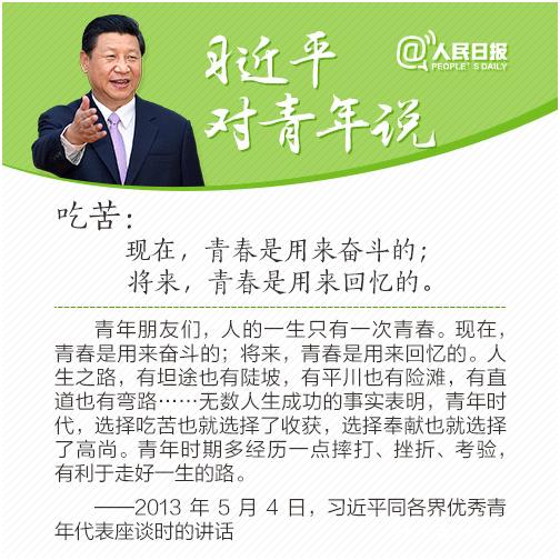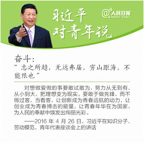 人民网北京5月4日电 人民日报微信公众平台于5月4日刊发《习近平对青年说的9句话》一文,全文内容如下: