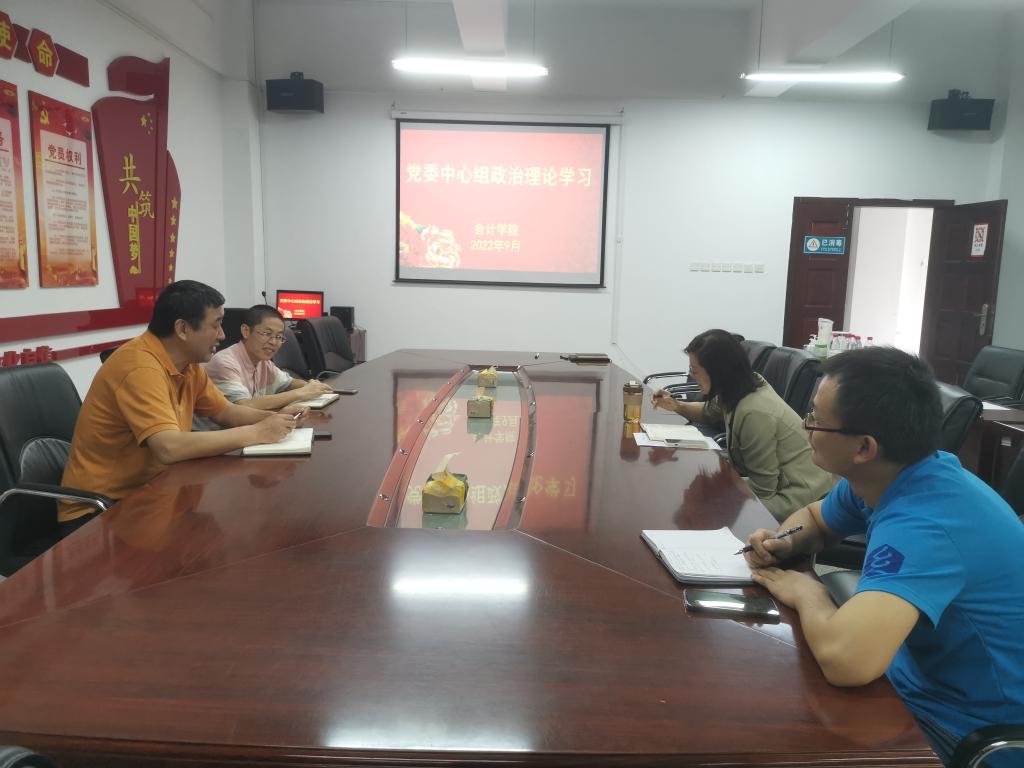 9月14日下午,会计学院党委理论学习中心组在崇德楼412会议室举行9月政治理论学习,学习习近平总书记在省部级主要领导干部“学习习近平总书记重要讲话精神,迎接党的二十大”专题研讨班上的重要讲话精神。会议由学院党委书记杜国良主持。